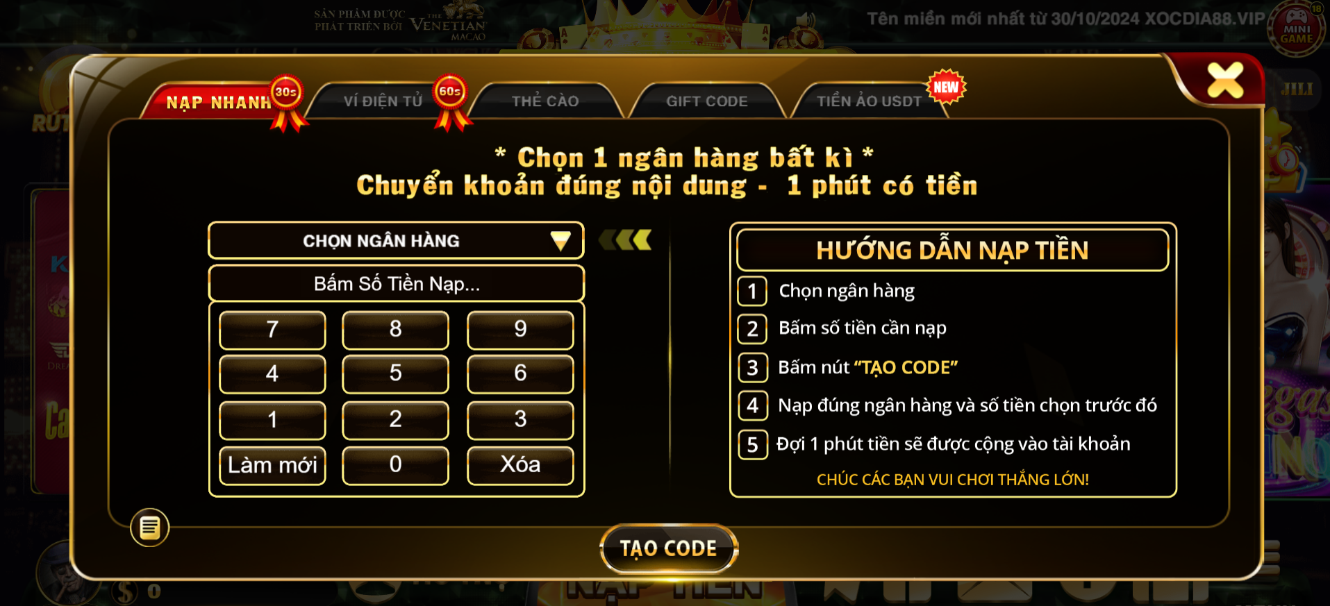 Nạp nhanh Xocdia88 1 phút có tiền ngay