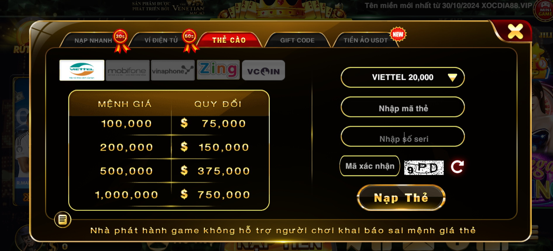 Cách nạp tiền Xocdia88 qua hình thức thẻ cào