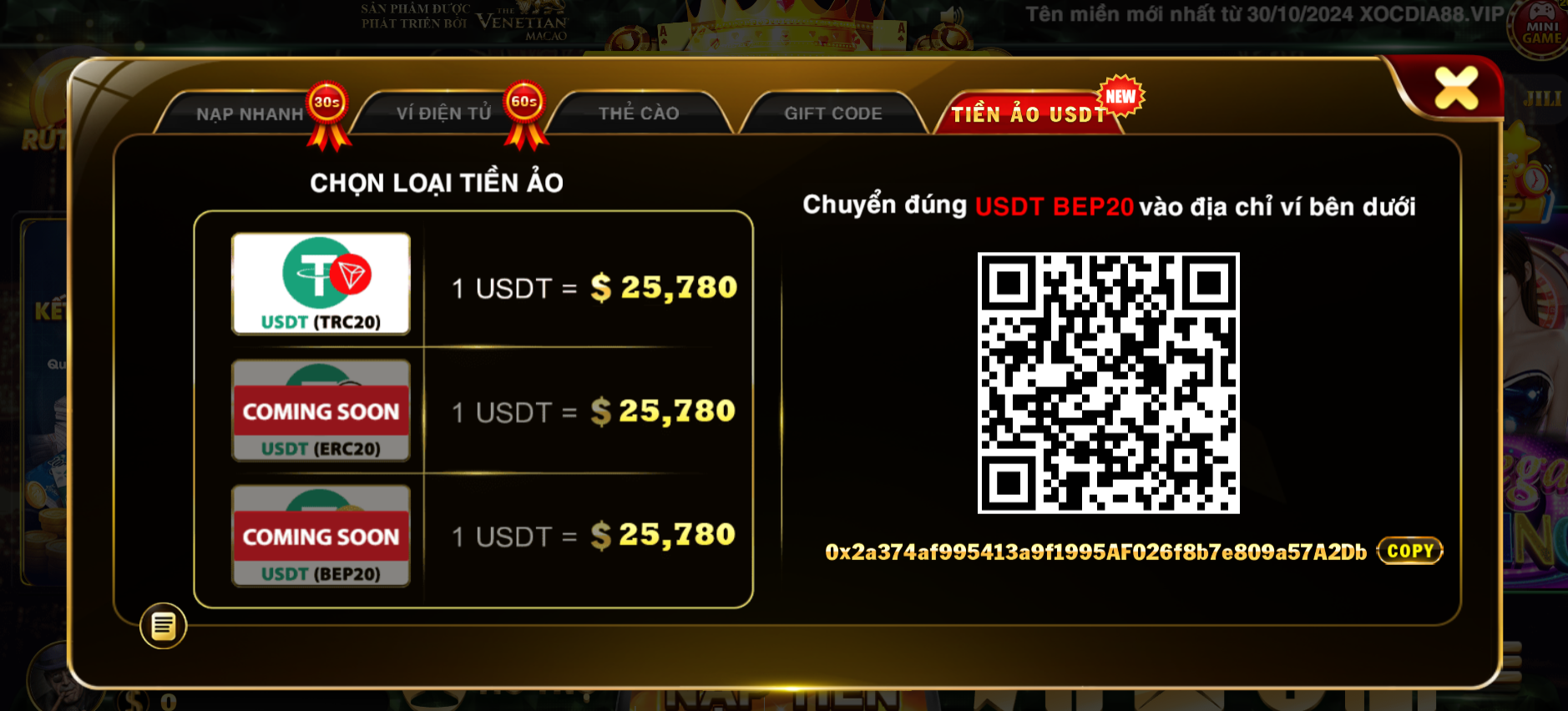 Hình thức giao dịch nạp tiền qua tiền ảo USDT tuy mới nhưng lại nhanh chóng được người chơi đón nhận. Hiện cổng game đang hỗ trợ 1 loại ví tiền ảo chính là USDT (TRC20) với giá trị quy đổi 1 USDT = 25.780$. Người chơi chỉ cần chuyển đúng USDT BEP20 vào địa chỉ ví do cổng game cung cấp. Hai cách lấy thông tin địa chỉ ví là quét mã QR hoặc sao chép mã trên màn hình.